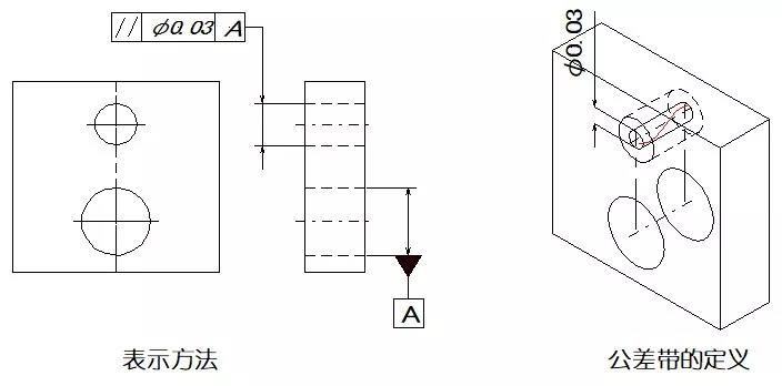 示例:如公差值前加注記號(hào)Φ、則公差帶為基準(zhǔn)平行直徑Φ0.03mm的圓柱面內(nèi)。